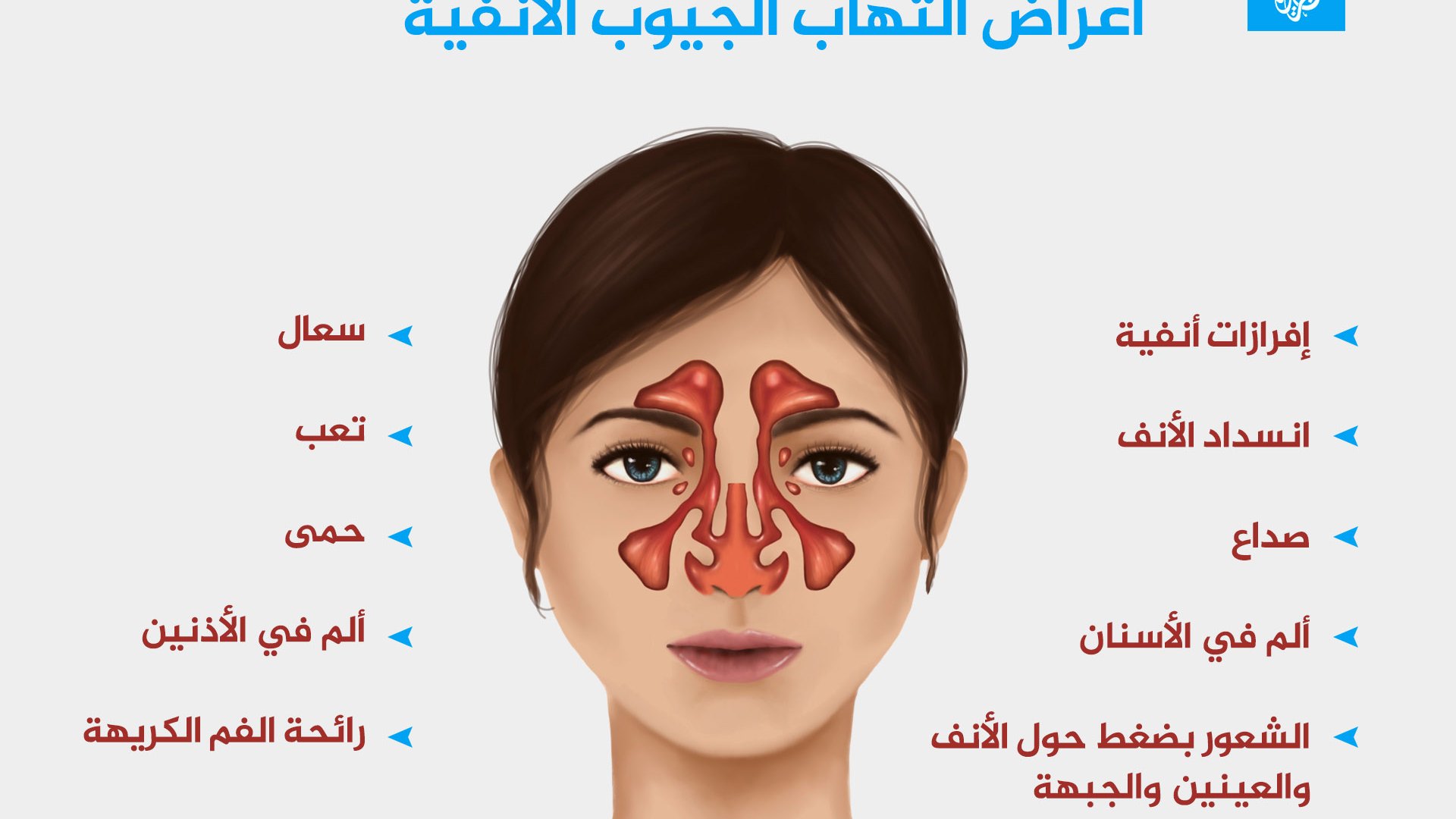 ووجود رائحه فم كريهة واذا كان الألم في الاسنان فمرجح ان تكون العدوى انتشار الى الاسنان ويشعر المريض بالغثيان المستمر ويجد اختلاف كبير في مذاق ورائحه الطعام وهناك ايضا الم شديد موجود في المنطقة حول العينين بالإضافة الى الإحساس والشعور بالضغط الشديد والالم في العينين وكذلك الم في الفكين بالإضافة الى زياده لزوجه المخاط بالأنف. علاج الجيوب الأنفية وتخفيف اعراض صداع الجيوب الأنفية